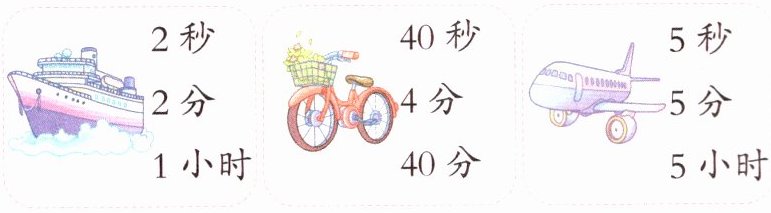 2分 4分 5秒【点拨】根据生活经验以及千米和米的感知进行判断。大型轮船每小时大约行驶30千米,行1千米用2分钟比较合适。自行车每小时约行15千米,行1千米大约需要4分钟。飞机每小时大约飞行800千米,速度较快,选择5秒比较合适。