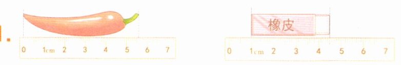 56 3 5【点拨】测量辣椒是从尺子的0刻度开始,右端对着5厘米后的第6个小格,也就是56毫米;测量橡皮是从1厘米开始,右端对着4厘米5毫米,橡皮的长度=4厘米5毫米-1厘米=3厘米5毫米。