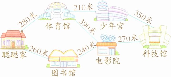 280+210+350=840(米)280+390+270=940(米)260+240+270=770(米)940>840>770 描线略 答:从聪聪家经过图书馆、电影院到达科技馆这条路最近,要走770米。