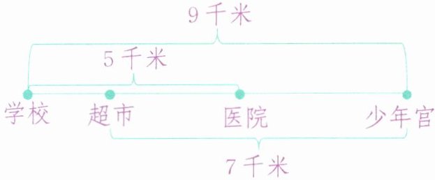 9-7=2(千米)5-2=3(千米)答:超市到医院的距离是3千米。【点拨】根据线段图可知,学校到超市的距离=学校到少年宫的距离-超市到少年宫的距离,列式为9-7=2(千米),超市到医院的距离=学校到医院的距离-学校到超市的距离,列式为5-2=3(千米)。