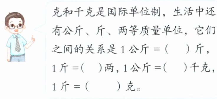 1. 认识了克、千克等质量单位,知道不同物品适合用不同单位计量。