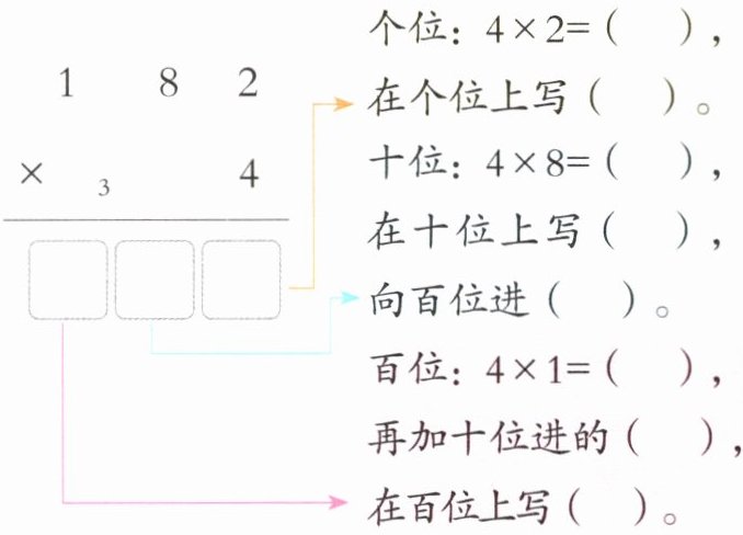 728 8 8 32 2 3 4 3 7【点拨】用一位数分别乘三位数各个数位上的数,哪一位上乘得的积满几十,就要向前一位进几,前一位乘完后所得的积不要忘记加上后一位的进位数。