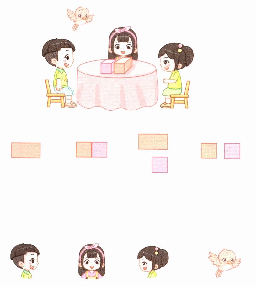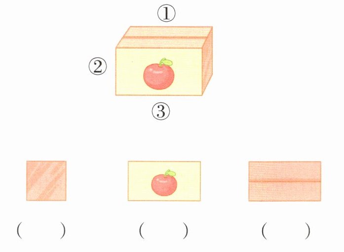 ② ③ ① [点拨]从①号方向看,看到的是箱子的上面,即看到的应该是中间有一条线的长方形;从②号方向看,看到的是箱子的侧面,即看到的应该是一个正方形;从③号方向看,看到的是箱子的前面,即看到的应该是带有苹果图案的长方形。
