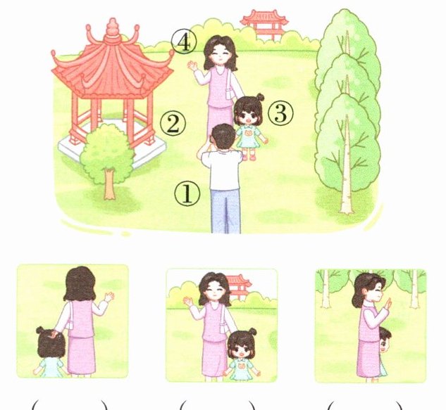 ④ ① ② [点拨]第一张照片是背影,是从后面拍摄的,故填④;第二张照片是正面照,是从前面拍摄的,故填①;第三张照片是从侧面拍摄的,且离妈妈更近,是从妈妈的右面拍摄的,故填②。