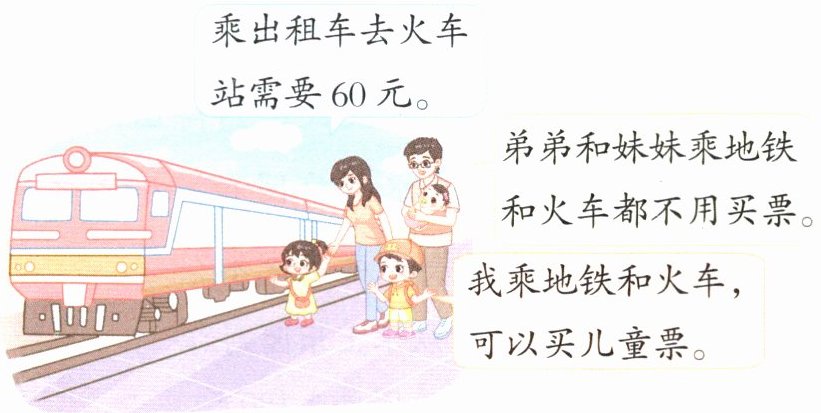 ①乘地铁去火车站,成人票每张8元,儿童票每张4元,乘地铁比乘出租车节省多少钱?
