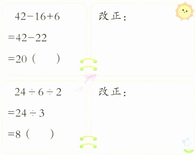 【点拨】两题都错在同级运算,没有按从左往右的顺序计算。