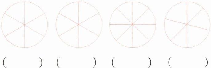 [点拨]第1个图形被平均分成6份,1份涂色,表示$\frac{1}{6}$。第2个图形被平均分成6份,2份涂色,表示$\frac{2}{6}$。第3个图形被平均分成8份,1份涂色,表示$\frac{1}{8}$。第4个图形不是平均分,无法用分数表示。