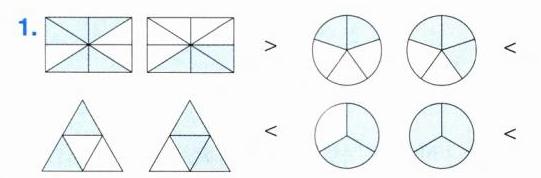 6. 先填一填涂色部分是整个图形的几分之几,再比较这两个分数的大小。