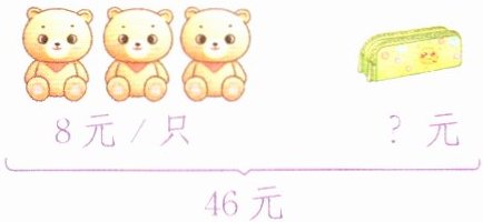 【点拨】(1)有5本书,每本9元,一共(9×5)元,要求坦克模型和这些书一共多少元,用加法计算,即45+9×5。(2)每只玩具熊8元,3只玩具熊(8×3)元,3只玩具熊和1个文具袋一共46元,要求文具袋的价格,用总价减去玩具熊的价格,即46-8×3。
