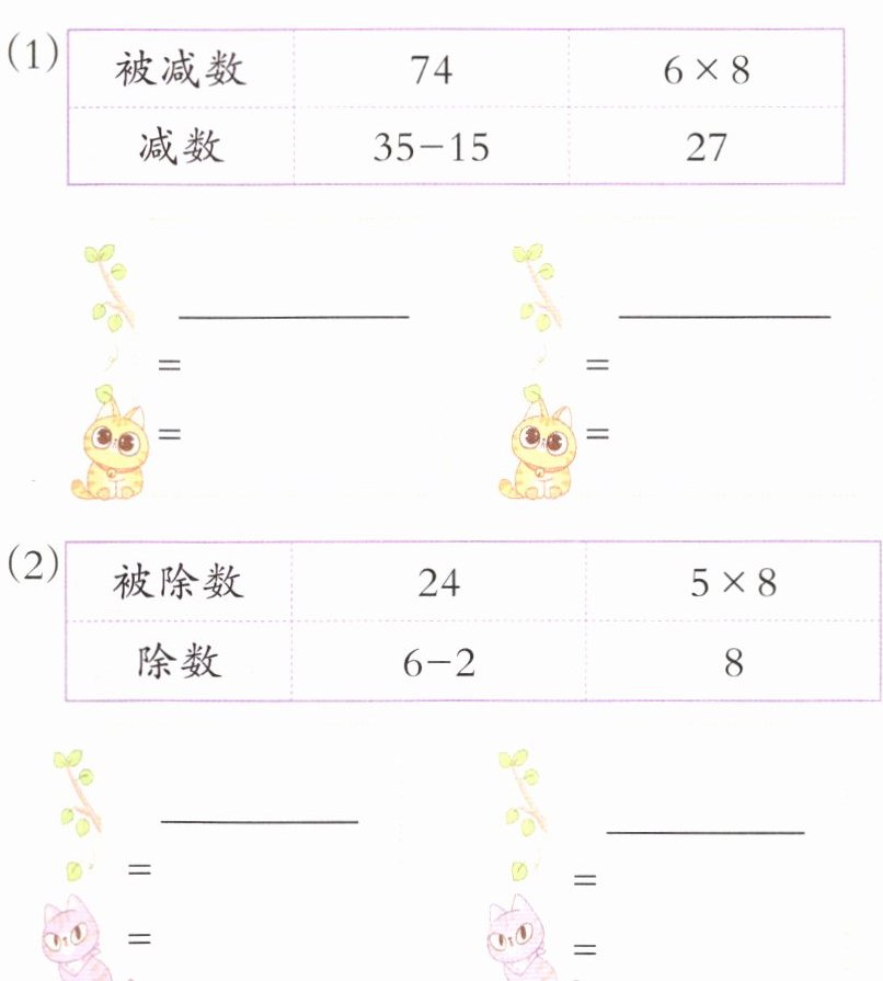 【点拨】根据“被减数-减数=差”和“被除数÷除数=商”列出综合算式。如:被减数是74,减数是“35-15”的差,是同级运算,但先算的是后面的减法,所以需要借助括号来先算“35-15”的差,写成综合算式是74-(35-15);被除数是24,除数是“6-2”的差,是两级混合运算,且先算减法,后算除法,所以需要借助括号来先算“6-2”的差,写成综合算式是24÷(6-2)。