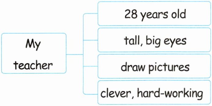 (思维导图内容:中心为“My teacher”,分支分别为:28 years old, tall, big eyes, draw pictures, clever, hard-working)
