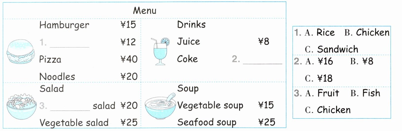 | ¥12 | Juice | ¥8 || Pizza | ¥40 | Coke | 2. ______