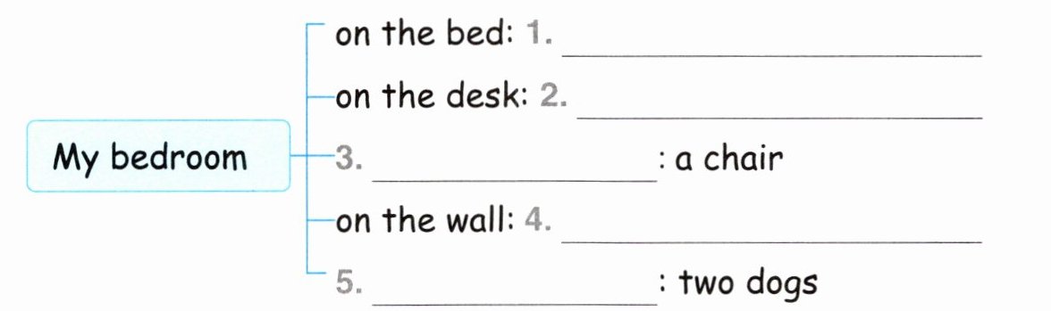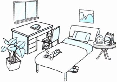 This is my bedroom. It's small but nice. There is a big bed in my room. ① There are some toys on my bed. They're very cute. The desk is white. ② There is a computer and many books on the desk. A chair is beside the desk. There is a picture on the wall. There are two dogs in the picture. They're black. I like my bedroom very much.