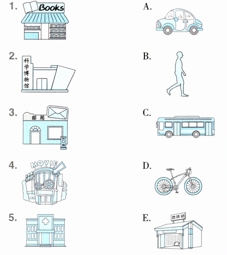 二 听句子,将城市设施与相应的交通方式连线。