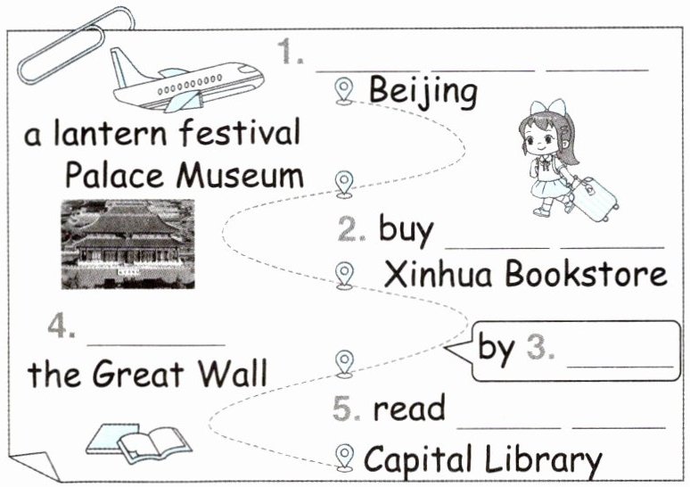 1. take a trip 2. some postcards 3. subway 4. visit 5. comic books