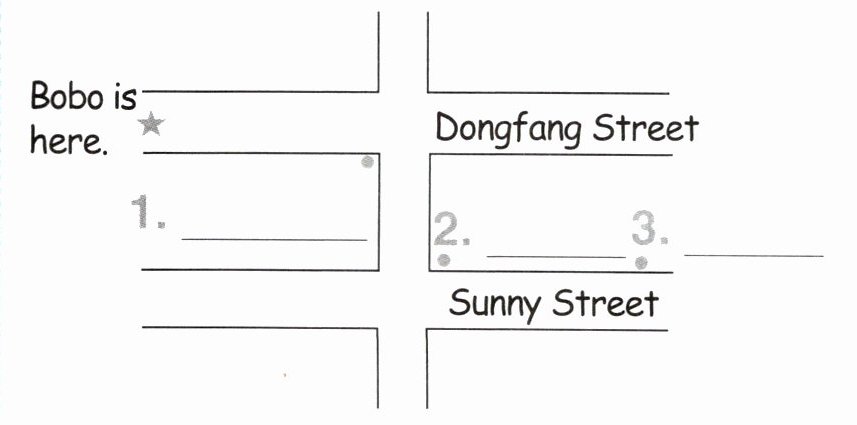任务二: 根据短文内容, 画出去科学博物馆的路线图, 并在横线上写出相应的建筑名称。