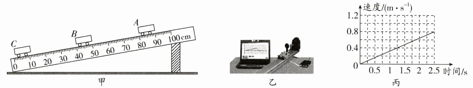 .(5)实验结束后小明调整装置,利用如图乙所示的位置传感器测出不同时刻小车与它的距离,计算机就可以计算出小车在不同位置的速度.屏幕图像如图丙所示,横轴为时间,纵轴为速度,通过图像可以看出小车在斜面上滑下时是