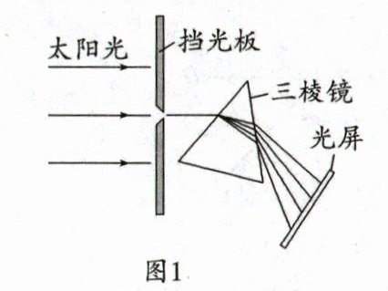 (2)光从空气射入其他介质时,折射角小于入射角,从其他介质射入空气时,折射角大于入射角;由图1可知,太阳光通过三棱镜后,分解成的色光都向三棱镜的底部方向偏折.彩色光带的颜色从上到下依次是红、橙、黄、绿、蓝、靛、紫,这种现象表明太阳光是由多种色光混合而成的,这就是光的士色散现象.
