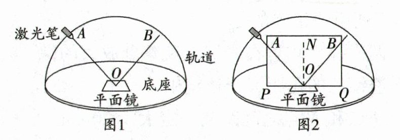 (2)多次改变激光笔在轨道上的位置,小红调整视角,均能观察到反射光 OB 挡住入射光 AO 的现象,如图 2 所示,将长方形纸板与 AO、OB 所在平面重合,其底边 PQ 紧贴平面镜,在纸板上即可显示出入射光和反射光,多次测出纸板和平面镜的夹角.