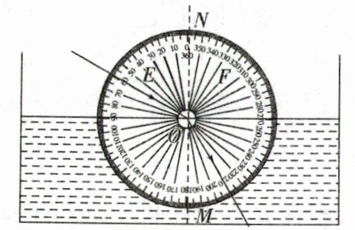 28. (12 分)如图是小明“探究光的折射规律”的实验装置,在水中竖直放置一块自制的刻有角度的圆形量角器,圆心 O 位于空气和水分界面处.