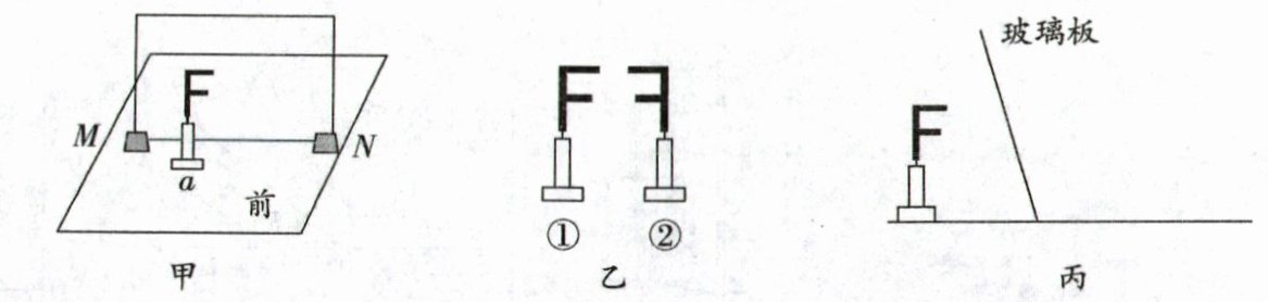 .(4)如图丙,将玻璃板倾斜,在白纸上不断移动物体 $ b $ 的位置,发现始终与物体 $ a $ 的像不能完全重合,物体 $ a $ 的像与物体 $ a $ 将
