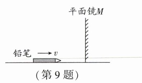 9. 如图所示,平面镜M直立在水平地面上,长6cm的铅笔平放在地面上且与平面镜垂直,笔尖离平面镜10cm,现铅笔以2cm/s的速度垂直平面镜向它匀速靠近.则(