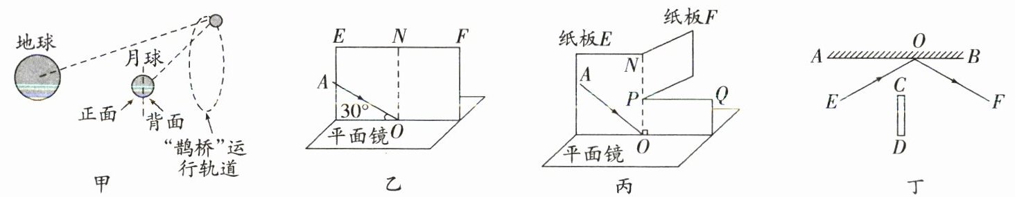 25. (6分)2024年嫦娥六号首次实现人类在月球背面采样并返回的壮举.在嫦娥六号完成任务过程中,如图甲是中继卫星"鹊桥"在地球和月背之间搭建的通信桥梁,鹊桥卫星位置和轨道的选择,小明认为需要探究光的反射定律才能确定位置.