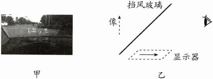 HUD是利用平面镜成像原理(如图乙),将显示器上的重要行车数据通过前挡风玻璃投射在正前方,驾驶员透过挡风玻璃往前方看的时候,能够轻易地将车外的景象与车辆信息通过挡风玻璃所成的像融合在一起.驾驶员不必低头,就可以看到车辆信息,如车速、油耗、导航等,从而避免分散对前方道路的注意力.同时驾驶员不必在观察远方的道路和近处的仪表之间调节眼睛,可避免眼睛疲劳,确保驾驶舒适安全.