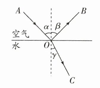 (2)若用激光沿CO方向从水中射入空气,激光在空气中传播的光路是______OA______(填“OA”或“OB”),激光经过水面反射时的反射角大小等于______γ______(填“$ \alpha $”“$ \beta $”或“$ \gamma $”),该现象说明了在折射现象中光路是______可逆______的.