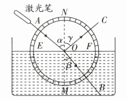 24.(8分)小强同学利用如图所示的实验装置探究“光的反射和折射规律”.在玻璃水槽中竖直放置的光屏是由$ E 和 F $两个半圆形光屏组成的,$ NOM $为两半圆的分界线,其中光屏$ F 可绕直径 NOM $前后折转.实验测量数据如表所示: