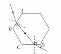 如图所示 解析: 光从六棱冰晶的AB面斜射入冰晶,传播方向向法线方向偏折,在冰晶的CD面,当光从冰晶斜射入空气中时,折射光线向远离法线方向偏折.