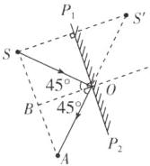由题可知,$\triangle SAS'$是等腰直角三角形,$\angle ASS'$是直角,$P_{1}P_{2}$是S S'的垂直平分线,所以O为$\triangle SAS'$斜边的中点,则SO为斜边的垂直平分线,所以SO是$\angle ASS'$的角平分线,所以$\angle ASO = 45^{\circ}$,OB为法线,与S S'平行,故可得入射角为45°,由光反射时的规律可得反射角也为45°.
