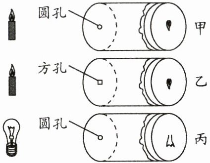 (2)甲、丙两图小孔形状相同,物体形状不同,像的形状也不同,所以小孔成像与物体的形状有关.
