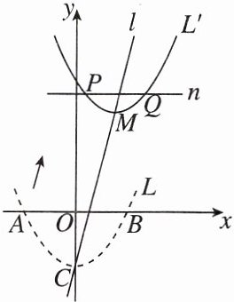 2. 新考法 分类讨论法 如图,抛物线 $ L: y = \frac{1}{4}x^2 - 4 $ 与 $ x $ 轴分别交于点 $ A, B $(点 $ A $ 在点 $ B $ 的左侧),与 $ y $ 轴交于点 $ C $。将 $ L $ 沿直线 $ l: y = 4x - 4 $ 向上平移,平移后的抛物线记作 $ L' $,其顶点 $ M $ 的横坐标为 $ t(t > 0 且 t \neq 2) $,设直线 $ n: y = t^2 $ 与抛物线 $ L' $ 分别交于点 $ P, Q $(点 $ P $ 在点 $ Q $ 的左侧)。