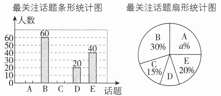 (1)实践小组在这次活动中,调查的学生共有____人;最关注话题扇形统计图中的 $ a = $____,话题 D 所在扇形的圆心角是____;