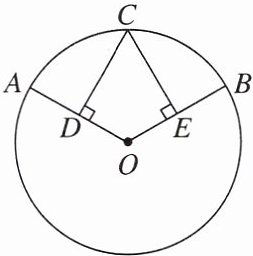 14. 如图,在$\odot O$中,$C为\overset{\frown}{AB}$的中点,$CD\perp OA于点D$,$CE\perp OB于点E$.