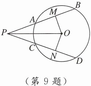 9. 如图,$AB$,$CD是\odot O$的两条弦,且$AB = CD$. $OM\perp AB$,$ON\perp CD$,垂足分别为$M$,$N$,$BA$,$DC的延长线交于点P$,连结$OP$. 下列结论:①$\overset{\frown}{AB}= \overset{\frown}{CD}$;②$OM = ON$;③$PA = PC$;④$\angle BPO = \angle DPO$. 其中正确的有(