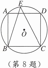 8. 如图,正方形$ABCD内接于\odot O$,点$E在\odot O$上。连结$BE$,$CE$,若$\angle ABE = 18^{\circ}$,则$\angle BEC-\angle DCE= $(