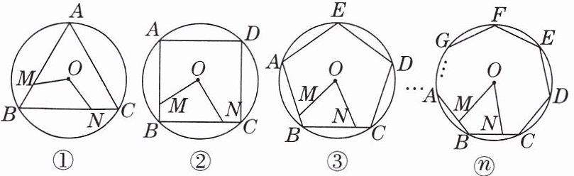 15. 新考法归纳法如图,$M$,$N分别是\odot O的内接正三角形ABC$,正方形$ABCD$,正五边形$ABCDE$,…$$,正$n边形ABCDEFG…的边AB$,$BC$上的点,且$BM = CN$,连结$OM$,$ON$。