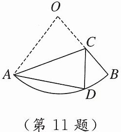 11. 如图,点C为扇形AOB的半径OB上一点,将$\triangle AOC$沿AC折叠,点O恰好落在$\overset{\frown}{AB}$上的点D处,且$\overset{\frown}{AD}:\overset{\frown}{DB} = 3:1$,若此扇形AOB的面积为$\frac{32}{9}\pi$,则$\overset{\frown}{AB}$的长为(