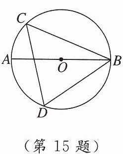 15. 如图,若AB是$\odot O$的直径,CD是$\odot O$的弦,$\angle CDB = 68^{\circ}$,则$\angle ABC$的度数为(