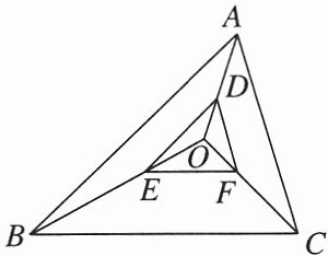 5. 如图,O是△ABC内一点,D,E,F分别是OA,OB,OC上的点,DE//AB,EF//BC,DF//AC。