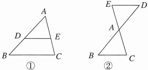 方法点拨:“A”型:如图①,由DE//BC,得△ADE∽△ABC;“X”型:如图②,由DE//BC,得∠E= ∠C,∠D= ∠B,则△ADE∽△ABC.