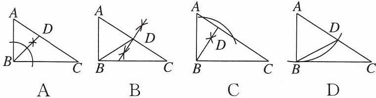8. 在$\triangle ABC$中,$\angle ABC = 90^{\circ}$,用直尺和圆规在$AC上确定点D$,使$\triangle ABD\sim\triangle BCD$,如下四个尺规作图,正确的是(
