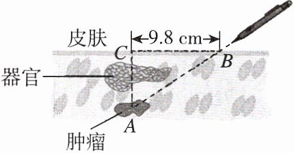 8. 情境题 生活应用 肿瘤患者在接受放射性治疗时,为了最大限度地保证疗效,并且防止伤害器官,射线必须从侧面照射肿瘤。如图,已知某患者的肿瘤在皮下$6.3\mathrm{cm}的A$处,射线从肿瘤右侧$9.8\mathrm{cm}的B$处进入身体,借助计算器求出射线与皮肤所成的锐角约为