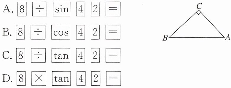 2. 母题 教材P12例1 如图,在$\triangle ABC$中,$\angle C = 90^{\circ}$,$\angle B = 42^{\circ}$,$BC = 8$,若用科学计算器求$AC$的长,则下列按键顺序正确的是(
