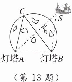 13. [2025杭州模拟] 如图,有一个弓形的暗礁区,弓形所含的圆周角$\angle C = 50^{\circ}$,船在航行时,为保证不进入暗礁区,则船到两个灯塔$A$,$B的张角\angle ASB$应满足的条件是(