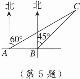 5. 母题教材P26作业题T3如图,一渔船在海上A处测得灯塔C在它的北偏东60°方向,渔船向正东方向航行12海里到达点B处,测得灯塔C在它的北偏东45°方向,若渔船继续向正东方向航行,则渔船与灯塔C的最短距离是____海里.