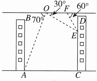 9. [2025绍兴模拟]某校“综合与实践”活动小组的同学要测量AB,CD两座楼之间的距离,他们借助无人机设计了如下测量方案:如图,无人机在AB,CD两楼之间上方的点O处,点O距地面AC的高度为66m,此时观测到楼AB底部点A处的俯角为70°,楼CD上点E处的俯角为30°,沿水平方向由点O飞行24m到达点F,测得点E处的俯角为60°,其中点A,B,C,D,E,F,O均在同一竖直平面内.(参考数据:sin70°≈0.94,cos70°≈0.34,tan70°≈2.75,$\sqrt{3}$≈1.73)