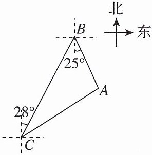 ∵A处在C岛的北偏东58°方向上,B市在C岛的北偏东28°方向上,